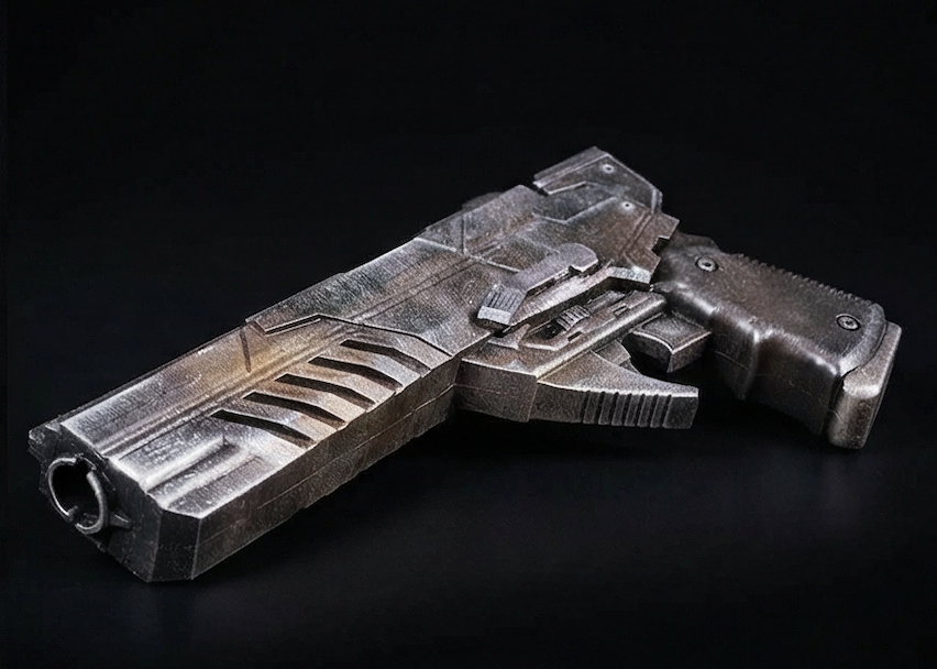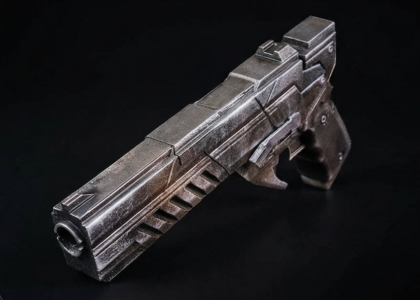 Precision sculpting of slides, barrels, grips, and engraved detailing for screen-accurate silhouette.